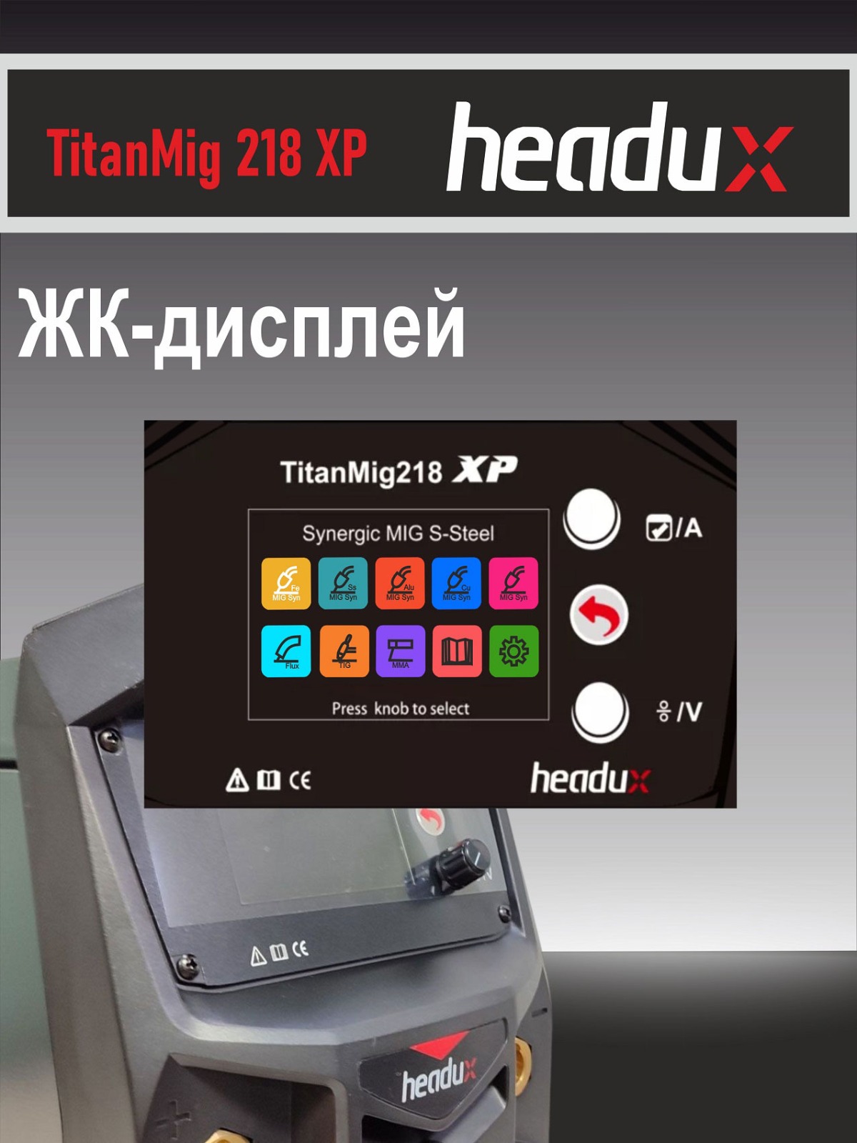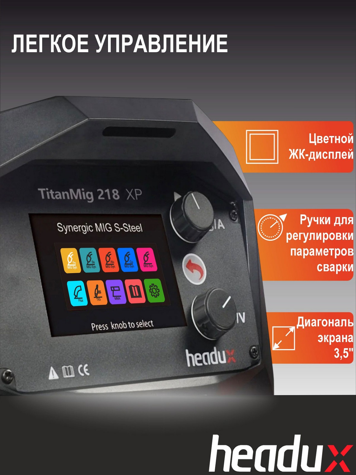 • Цветной дисплей 3,5 дюйма с удобными ручками регулировки сварочных параметров